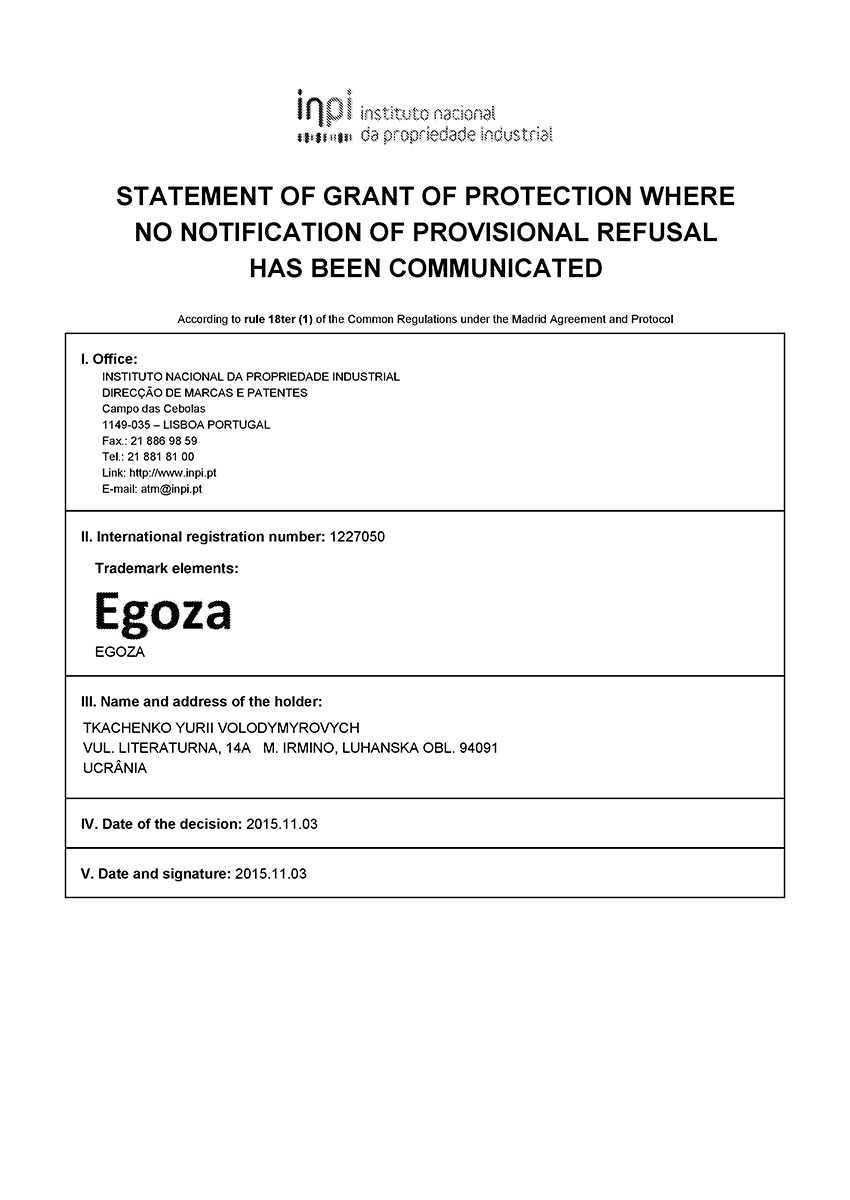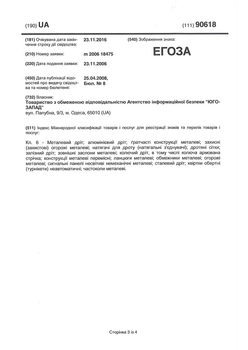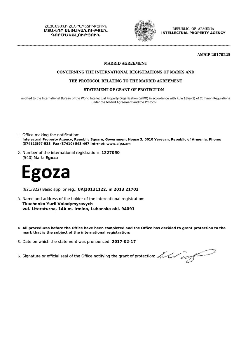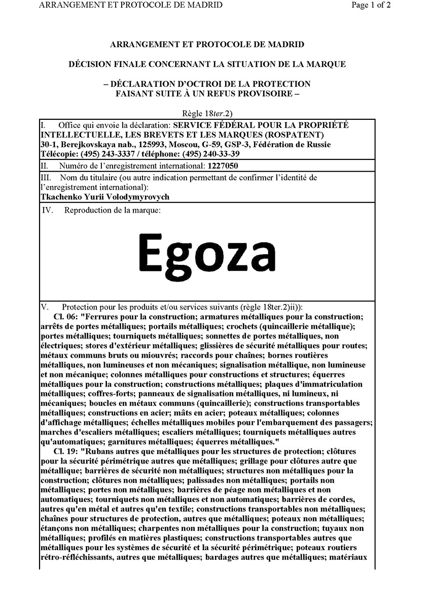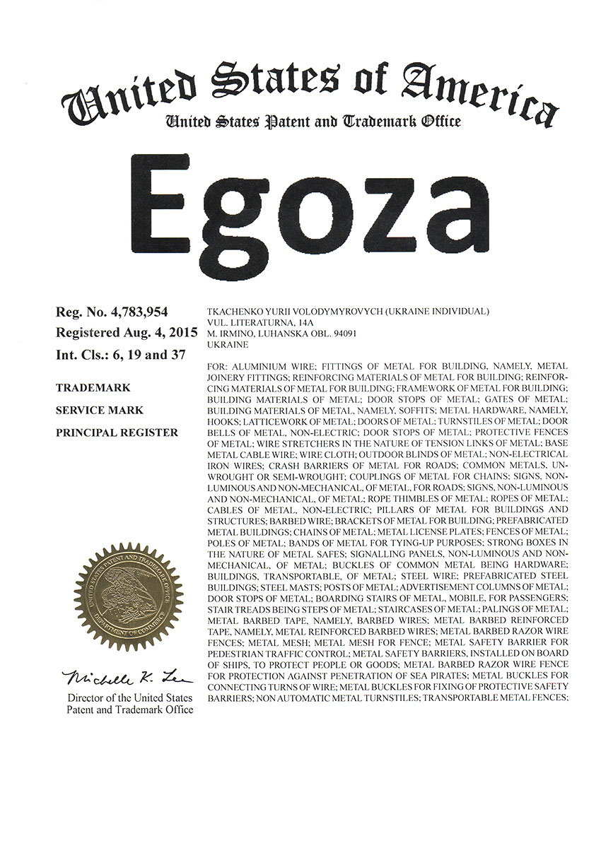 Торговая марка Егоза зарегистрирована в 99 странах мира по Мадридской системе. Эта торговая марка используется для обозначения широкого ассортимента изделий, предназначенных для создания инженерной защиты периметра объектов. К ним относится колючая лента Егоза, армированная колючая лента Егоза-Стандарт, Егоза-Кайман, Егоза-Аллигатор и Егоза-Супер, а также различные типы колюче-режущих заграждений – плоские, спиральные, пирамидальные, мобильные и другие заграждения Егоза.