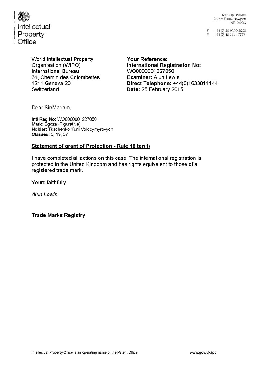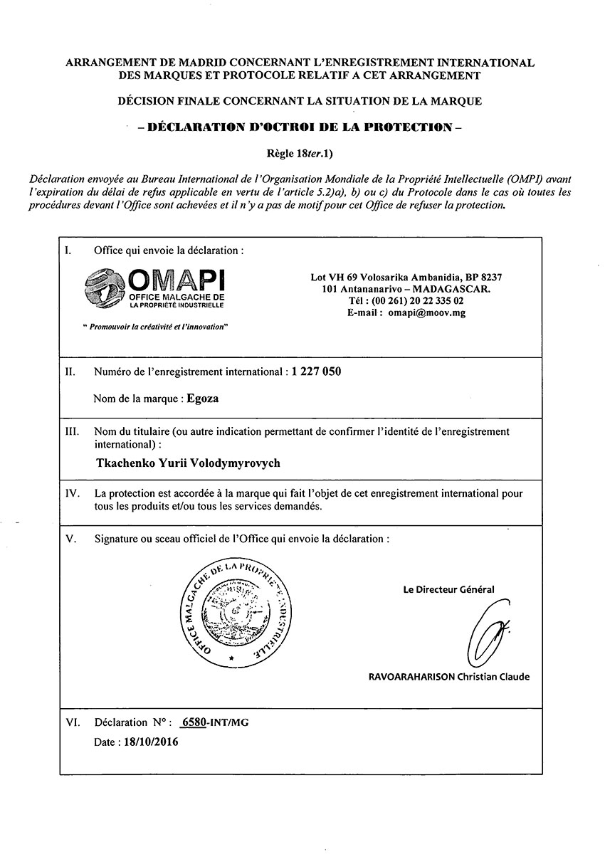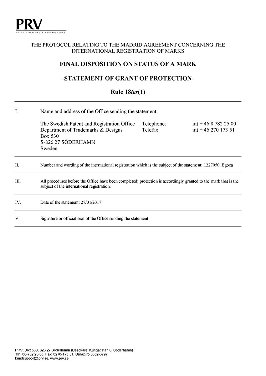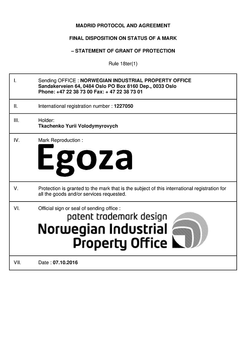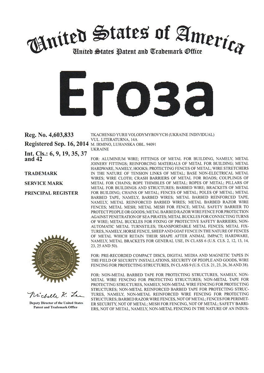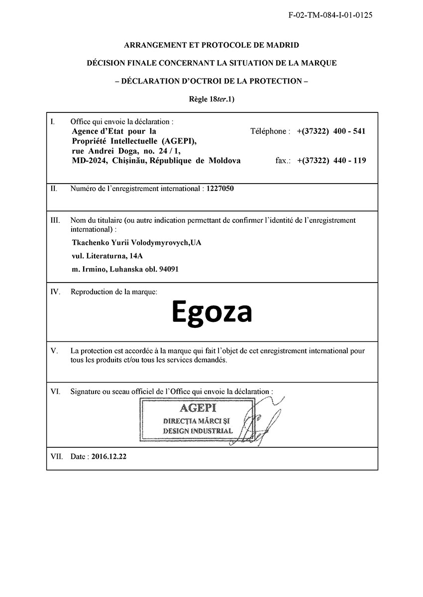 Торговая марка Егоза зарегистрирована в 99 странах мира по Мадридской системе. Эта торговая марка используется для обозначения широкого ассортимента изделий, предназначенных для создания инженерной защиты периметра объектов. К ним относится колючая лента Егоза, армированная колючая лента Егоза-Стандарт, Егоза-Кайман, Егоза-Аллигатор и Егоза-Супер, а также различные типы колюче-режущих заграждений – плоские, спиральные, пирамидальные, мобильные и другие заграждения Егоза.
