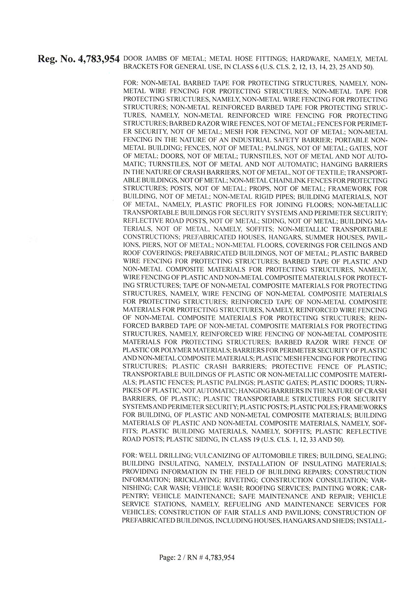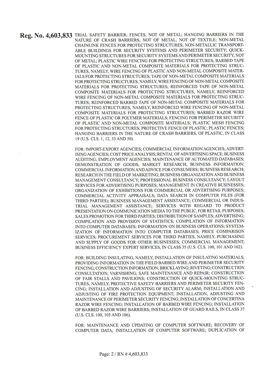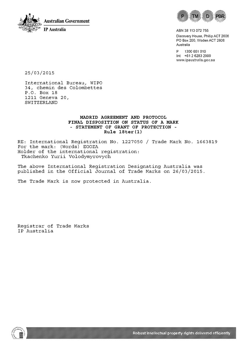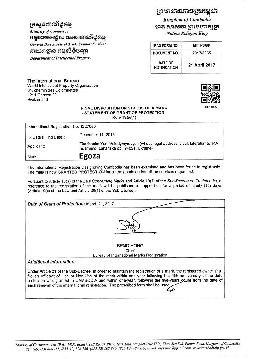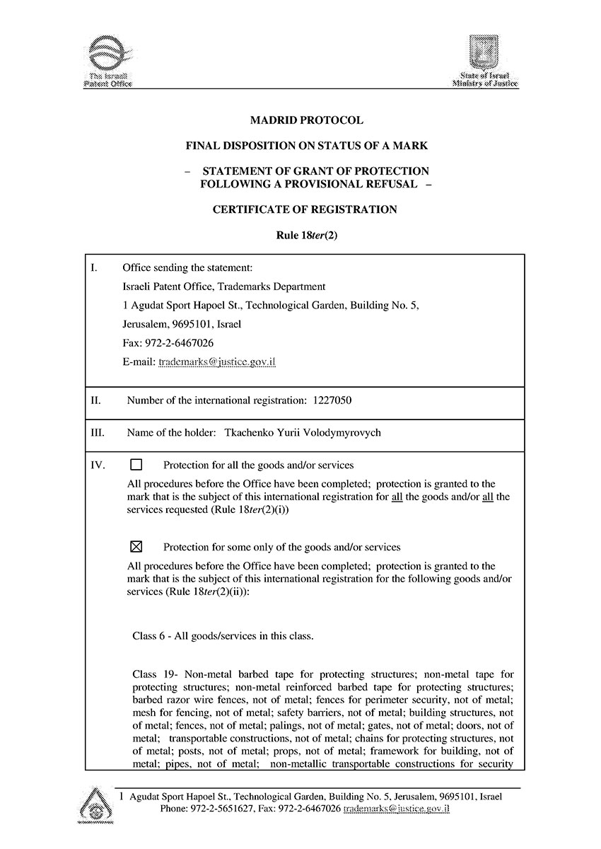 Торговая марка Егоза зарегистрирована в 99 странах мира по Мадридской системе. Эта торговая марка используется для обозначения широкого ассортимента изделий, предназначенных для создания инженерной защиты периметра объектов. К ним относится колючая лента Егоза, армированная колючая лента Егоза-Стандарт, Егоза-Кайман, Егоза-Аллигатор и Егоза-Супер, а также различные типы колюче-режущих заграждений – плоские, спиральные, пирамидальные, мобильные и другие заграждения Егоза.