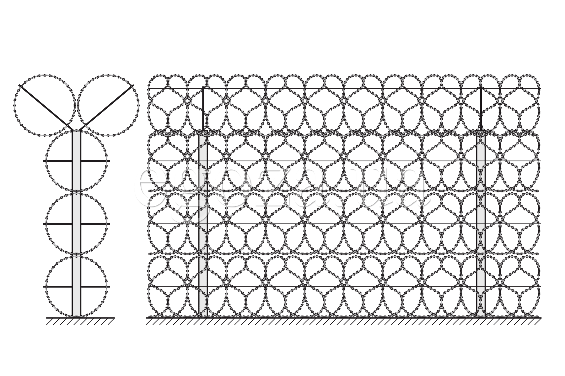 Забор из спирального заграждения Егоза состоит из нескольких спиральных заграждений, закрепленных на столбах или вспомогательных металлоконструкциях. Забор из спирального барьера является одним из самых надежных ограждений территории. Забор из спиральных заграждений СББ Егоза рекомендуется для наиболее важных объектов.